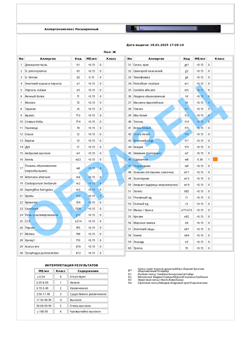 Аллергокомплекс расширенный PROTIA (Корея), IgE включает следующие аллергены: домашняя пыль, D. pteronyssinus, D. farinae, эпителий кошки, перхоть собаки, яичный белок, молоко, таракан, арахис, соевые бобы, пшеница, ольха, берёза, дуб, амброзия высокая, хмель, полынь, Alternaria alternate, Cladosporium herbarum, Aspergillus fumigatus, крабы, креветки, скумбрия, рожь, CCD, персик, яблоко, кунжут, Acarus siro, Tyrophagus putrescentiae, смесь (колосок душистый, ежа сборная, тростник обыкновенный, полевица), свинорой пальчатый, тимофеевка, Penicillium notatum, Candida albicans, лещина обыкновенная, маслина европейская, платан, ива белая, тополь, ясень белый, сосна белая, японский кедр, акация, нивяник (поповник), одуванчик, подорожник, зольник, золотарник, амарант, латекс, пчелиный яд, осиный яд, смесь (мышь, крыса), кролик, морская свинка, эпителий овцы, хомяк, лошадь, треска, смесь (тунец, лосось), смесь (камбала, анчоус (хамса), сайда), смесь (лобстер, кальмар), угорь, смесь (мидии, устрицы, морской моллюск, гребешок), куколка шелкопряда, свинина, говядина, куриное мясо, баранина, сыр Чеддер, мука ячменная, рис, мука гречневая, пекарские дрожжи, кукуруза, морковь, картофель, смесь (чеснок, лук), сельдерей, огурец, томаты, апельсин, клубника, смесь (киви, манго, банан), каштан, грецкий орех, фундук, смесь (миндаль, кедровый орех, подсолнечник), какао.