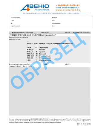 | кЕдА/л | КЛАСС | УРОВЕНЬ IgE |