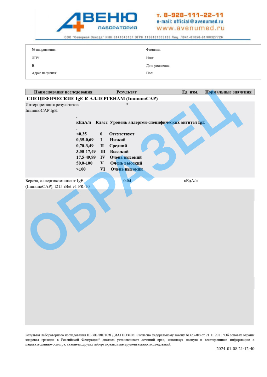 Анализ на аллергокомпонент IgE (Береза, ImmunoCAP), t215 rBet v1 PR-10 в Батайске