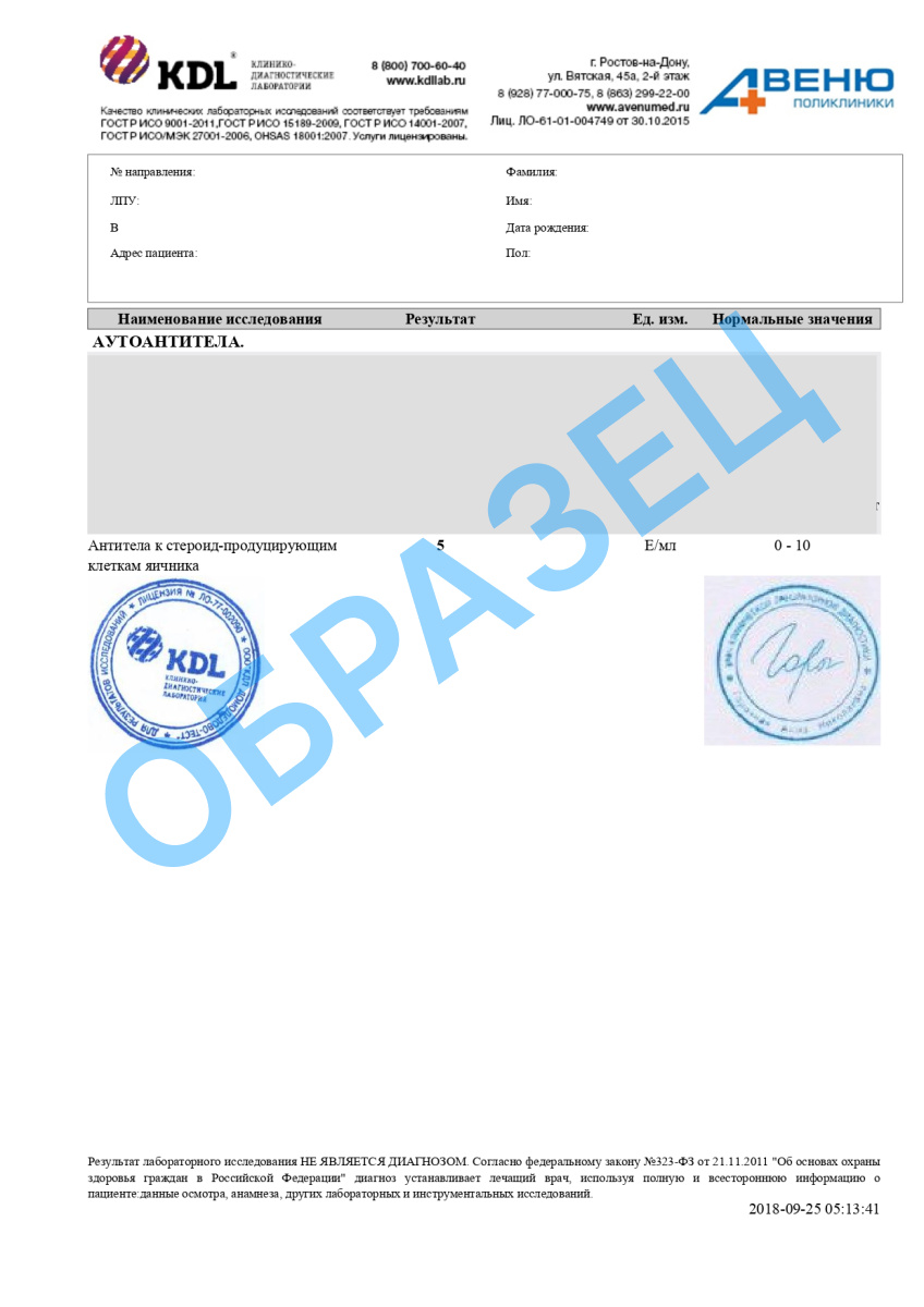 В основном встречаются IgG-антитела к ткани яичников, антитела IgA и IgM находят только в половине положительных образцов. В отличие от других эндокринных аутоиммунных заболеваний, по концентрации гормонов нельзя прогнозировать возможный аутоиммунный процесс в яичниках. Таким образом, АОА – показатель возможной яичниковой недостаточности, и их избыток может привести к гормональным изменениям. Рекомендуется определять АОА: