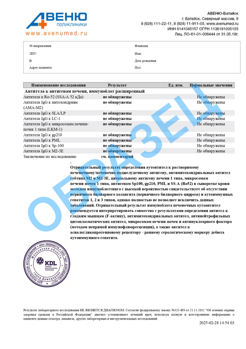Антитела к антигенам печени, иммуноблот расширенный (антитела к SLA/LP, LC1, LKM1, PDC-AMA-M2, M2-3E, Sp100, PML, gp210, SSA/Ro-52), IgG, качественно