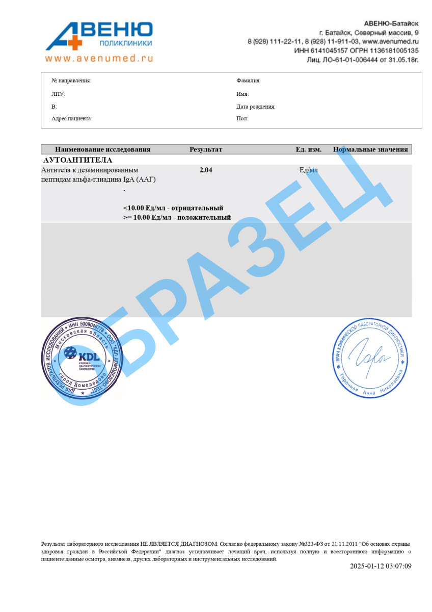 Антитела к дезаминированным пептидам альфа-глиадина IgА (ААГ), количественно