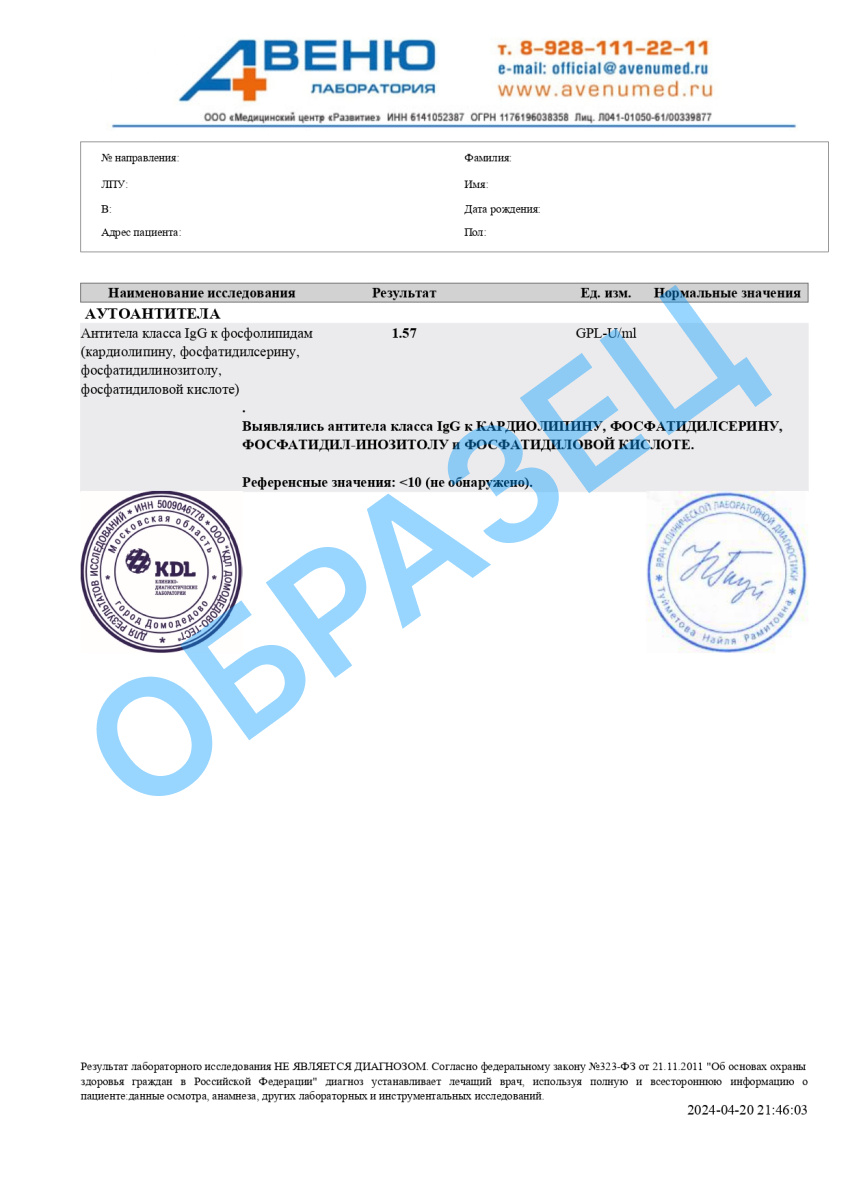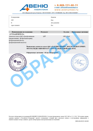 Результат выдается отдельный по IgM к фосфолипидам и IgG к фосфолипидам