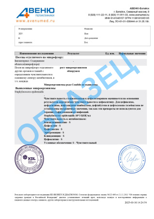 Разъяснение результатов анализов предоставляет важные сведения для доктора и не служит основанием для установления диагноза. Данные, полученные в ходе анализов, не должны применяться пациентами для самостоятельной диагностики или лечения. Окончательный диагноз определяется медицинским специалистом на основе комплексного анализа результатов данного исследования, а также истории болезни и данных из других диагностических процедур.