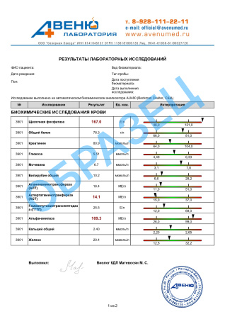 Биохимический анализ крови, расширенный (общий белок, мочевина, креатинин, билирубин общий, АЛТ, АСТ, ЩФ, альфа-амилаза, ГГТП, железо, мочевая кислота, холестерин общий, триглицериды, кальций общий, глюкоза), количественно