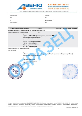 Определение Омега-3 индекса (оценка риска внезапной сердечной смерти, инфаркта миокарда и др. сердечно-сосудистых заболеваний), количественно