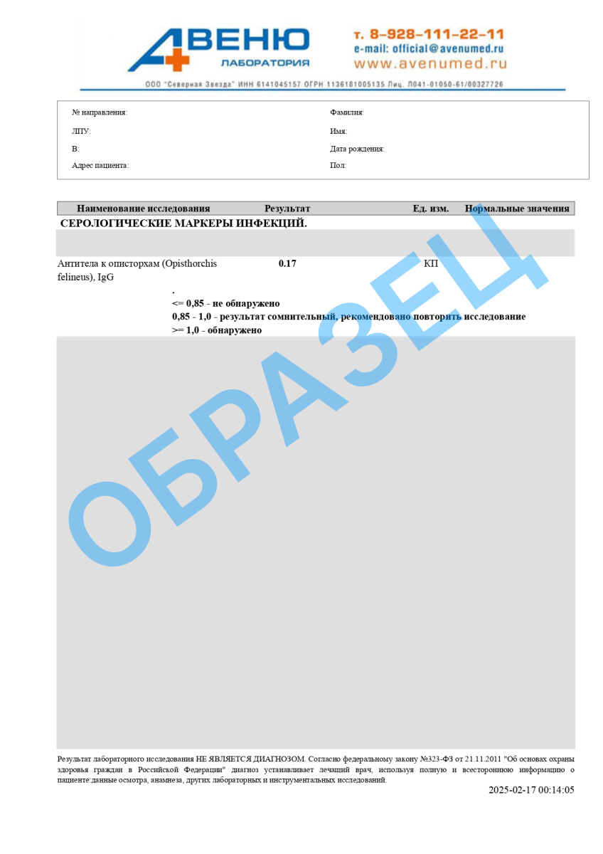 Лабораторный анализ с определением антител к антигенам описторхиса (Opisthorchis felinius) входит в комплексное обследование при подозрении на описторхоз. Это заболевание опасно тем, что может долгое время не давать симптомы, а в это время паразит Opisthorchis felineus, она же кошачья двуустка, будет повреждать печень, внепечёночные протоки, желчный пузырь и поджелудочную железу. Длительное течение повышает риск новообразований в печени, развитие сахарного диабета и бронхиальной астмы.