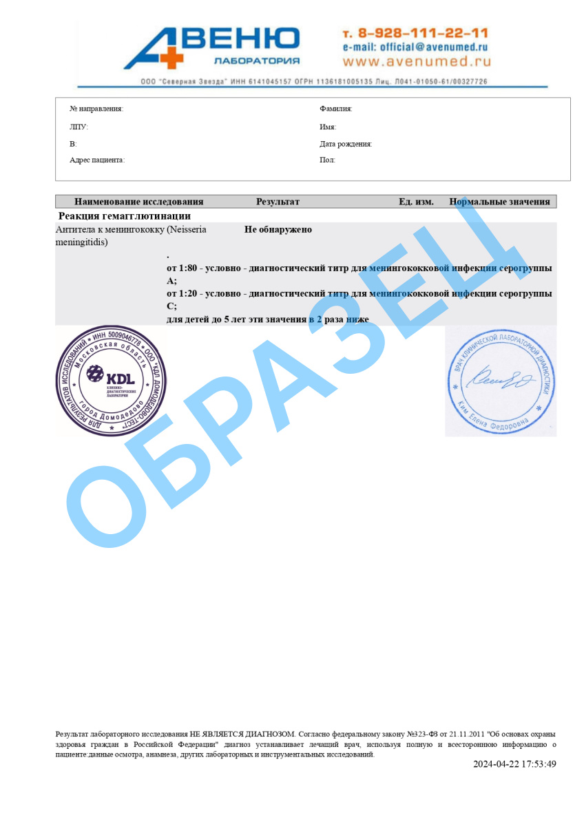 A26.06.109 Определение антител к возбудителю менингококка (Neisseria meningitidis) в крови