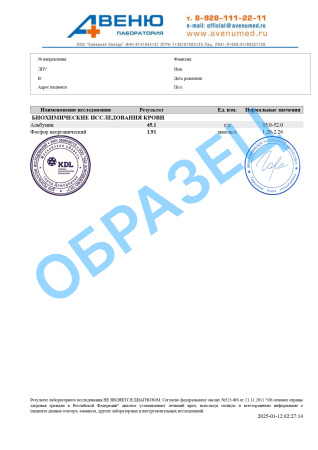 Всё начинается с забора венозной крови у пациента в одном из филиалов поликлиник АВЕНЮ. После чего она попадает в лабораторию для количественного определения фосфора при помощи колориметрического метода. Образец крови помещается в пробирку вместе со специальными растворами и проводится центрифугирование, после которого специалист забирает 1 мл надосадочной жидкости в отдельную пробирку. Берёт вторую, контрольную, пробирку и помещает в неё 1 мл дистиллированной воды. В эти 2 пробирки добавляется молибденовый реактив, содержимое каждой перемешивают и спустя некоторое время добавляют ещё растворы. А уже после 10-минутного пребывания при комнатной температуре специалист их колориметрирует с зелёным светофильтром (использует аппарат-колориметр) и затем проводит расчёт концентрации фосфора по калибровочной кривой.