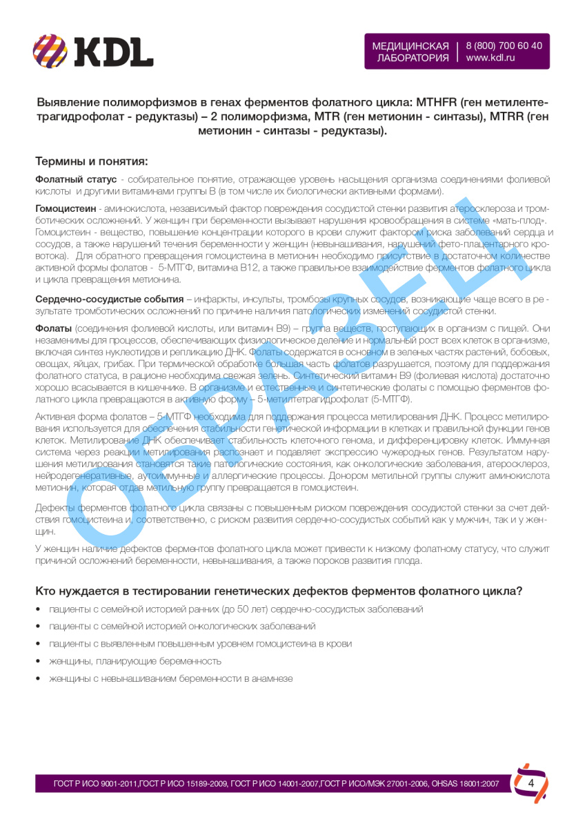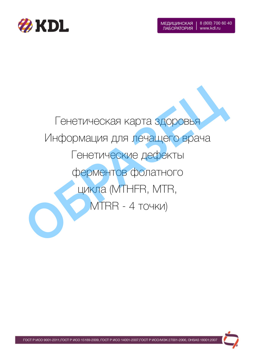Генетические дефекты ферментов фолатного цикла (MTHFR, MTR, MTRR - 4 точки)
