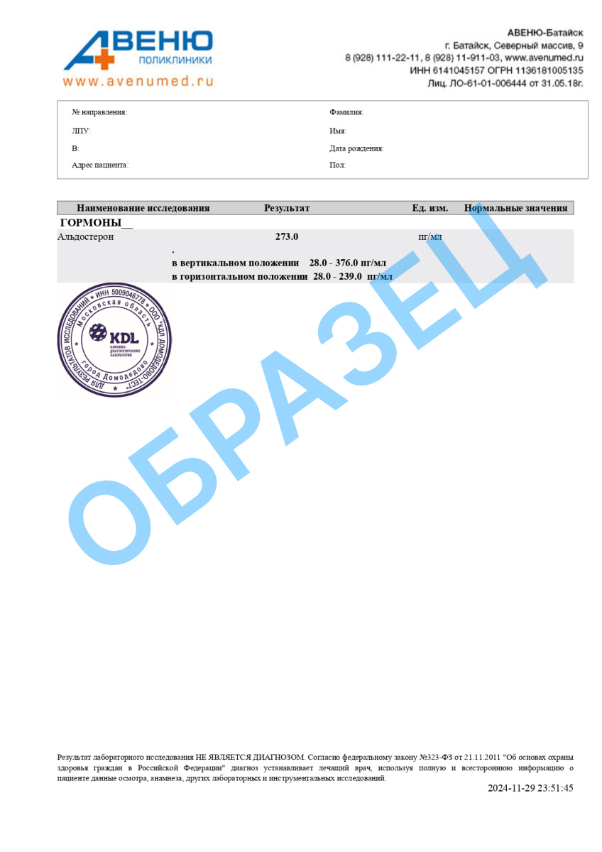 В любом из филиалов поликлиник АВЕНЮ вы можете сдать анализ крови на альдостерон по доступной цене и получить результат спустя 6 дней.