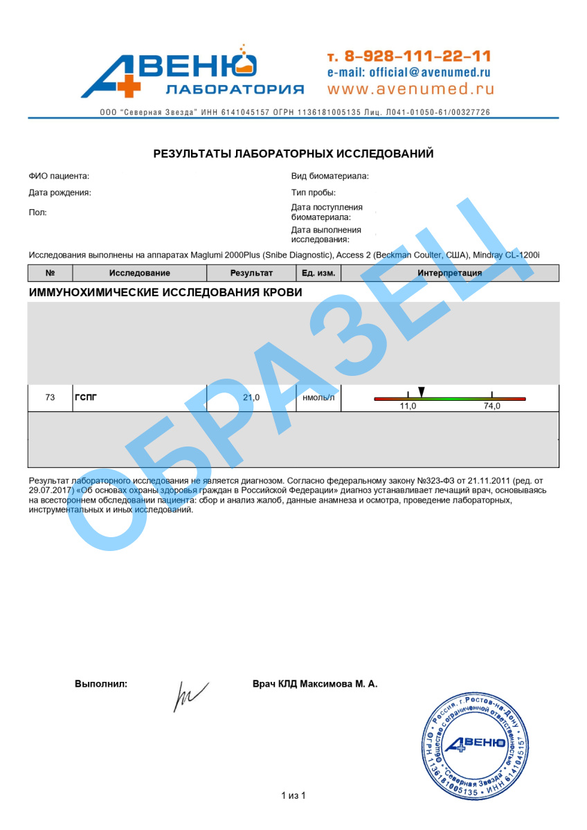 В поликлиниках АВЕНЮ можно сдать кровь на анализ с определением ГСПГ по доступной цене, в удобном филиале и быстрым результатом уже через 2 дня.