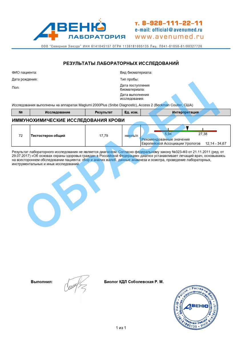 Вы можете сдать анализ на тестостерон в любом из медицинских центров АВЕНЮ: выберите ближайший филиал, приезжайте в удобное время и получите приятное обслуживание — проведём исследование быстро, с высокой точностью и по выгодной цене. Результат будет готов через 2 дня.