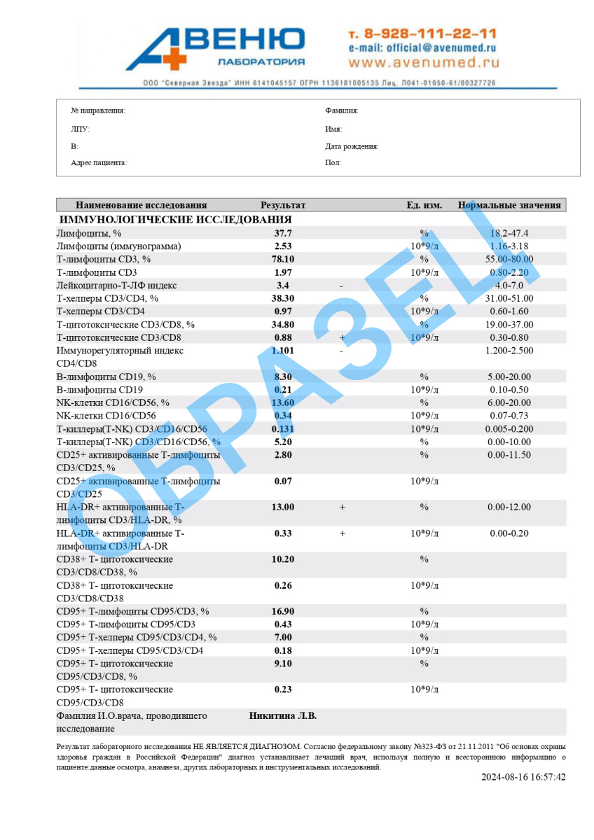 Иммунограмма расширенная (CD3, CD3/4, CD3/8, CD19, CD16/56, CD3/16/56, CD3/HLA-DR, CD3/25, CD3/95, CD3/4/95, CD3/8/95, CD3/8/38, лейкоцитарно-Т-ЛФ индекс, иммунорегуляторный индекс, анализ крови с лейкоцитарной формулой)
