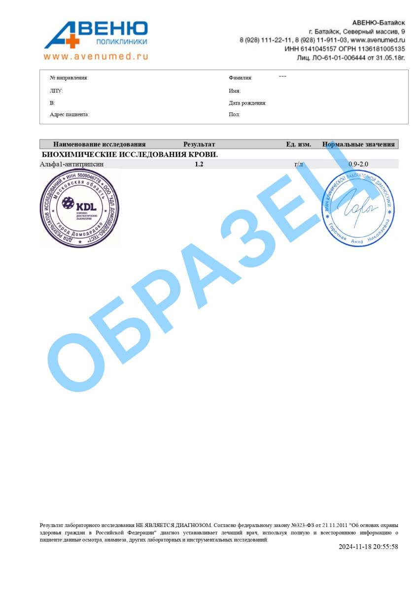 Комплекс исследований для диагностики недостаточности альфа1 антитрипсина* B03.019.012