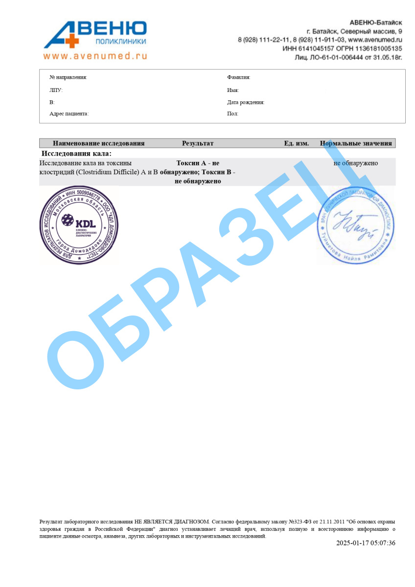 A26.19.043 Определение токсинов возбудителя диффициального клостридиоза (Clostridium difficile) в образцах фекалий