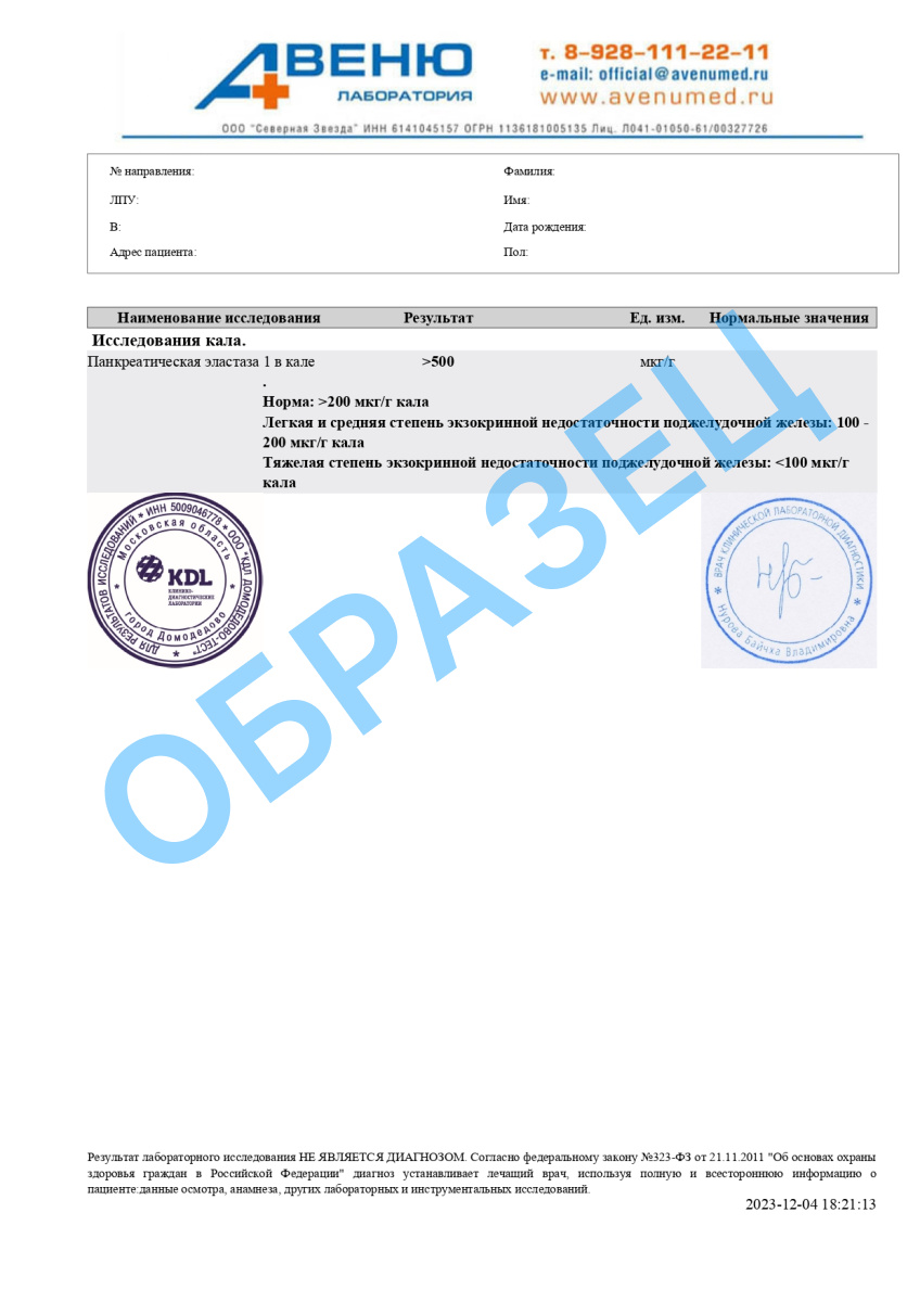 Тяжелая степень экзокринной недостаточности поджелудочной железы характеризуется значениями менее 100 мкг/г кала.Разъяснение результатов анализов предоставляет важные сведения для доктора и не служит основанием для установления диагноза. Данные, полученные в ходе анализов, не должны применяться пациентами для самостоятельной диагностики или лечения. Окончательный диагноз определяется медицинским специалистом на основе комплексного анализа результатов данного исследования, а также истории болезни и данных из других диагностических процедур.