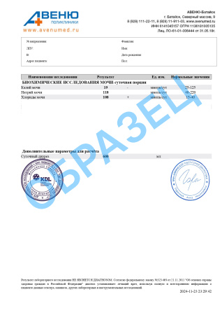 Натрий, калий, хлор суточной мочи (Na/K/Cl), количественно
