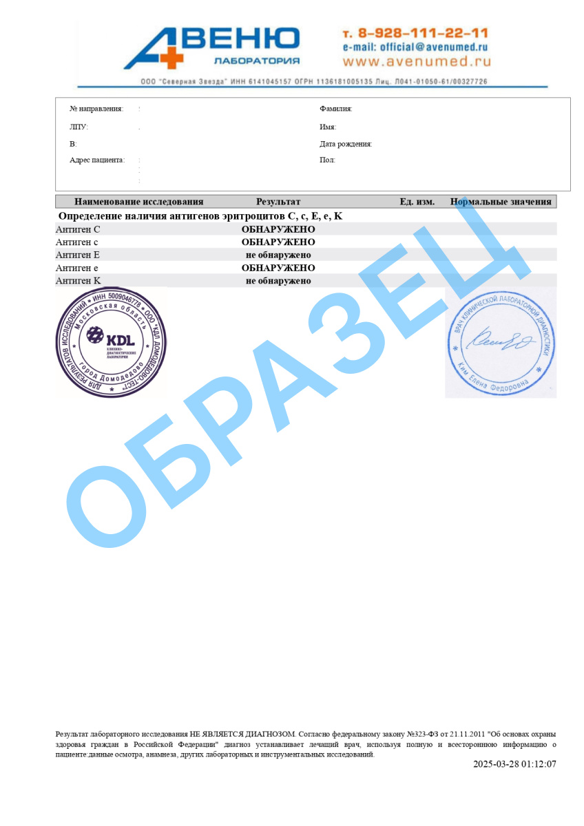 A12.05.007.001 Определение фенотипа по антигенам C, c, E, e, Cw, K, k и определение антиэритроцитарных антител