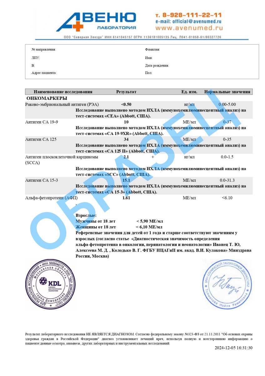 | СА-125 | 0-29 | Ед/мл |