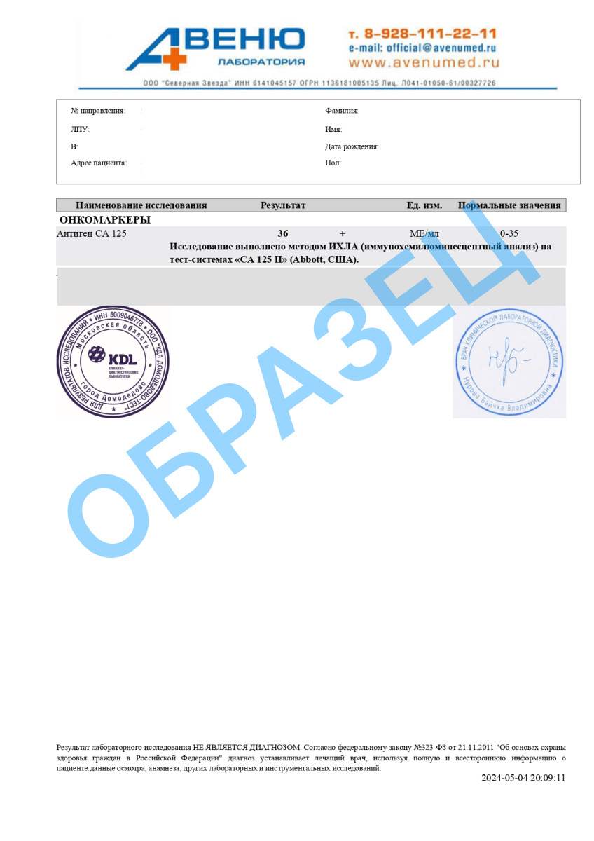 A09.05.202 Исследование уровня антигена аденогенных раков CA 125 в крови