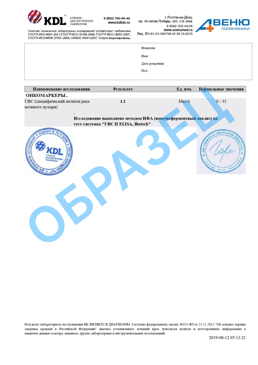 Анализ на UBC (моча) – определение антигена рака мочевого пузыря. UBC является чувствительным маркером разрастания опухолевых клеток.