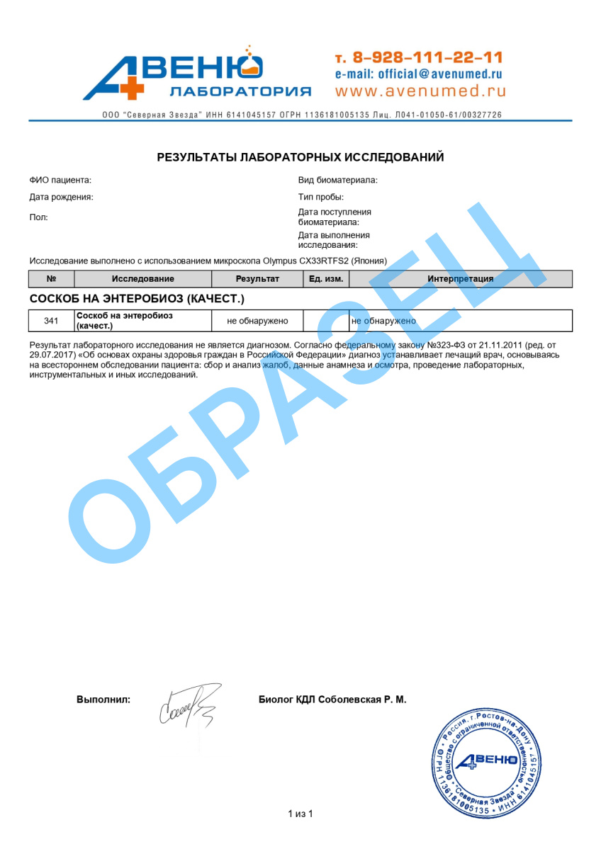 В медцентрах АВЕНЮ (Ростов-на-Дону и Батайск) можно сдать анализ кала на энтеробиоз (перианальный соскоб на энтеробиоз). Низкая стоимость процедуры. Нажмите, чтобы узнать сколько стоит анализ.