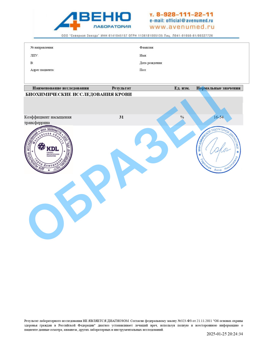 В поликлиниках АВЕНЮ вы можете определить коэффициент насыщения трансферрина железом по доступной цене — просто выберите ближайший филиал и удобный день для сдачи крови.