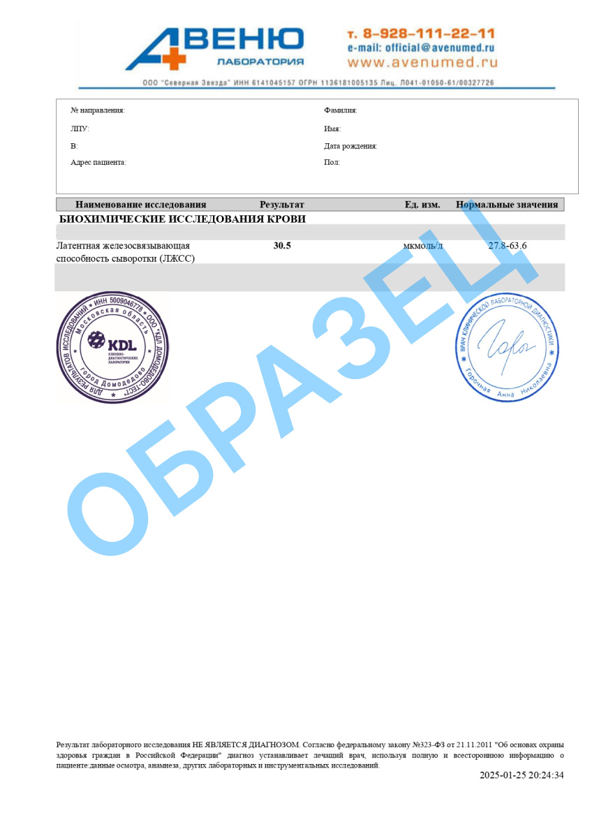 Латентная железосвязывающая способность сыворотки (ЛЖСС), количественно
