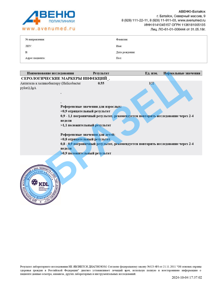 A26.06.033 Определение антител к хеликобактер пилори (Helicobacter pylori) в крови