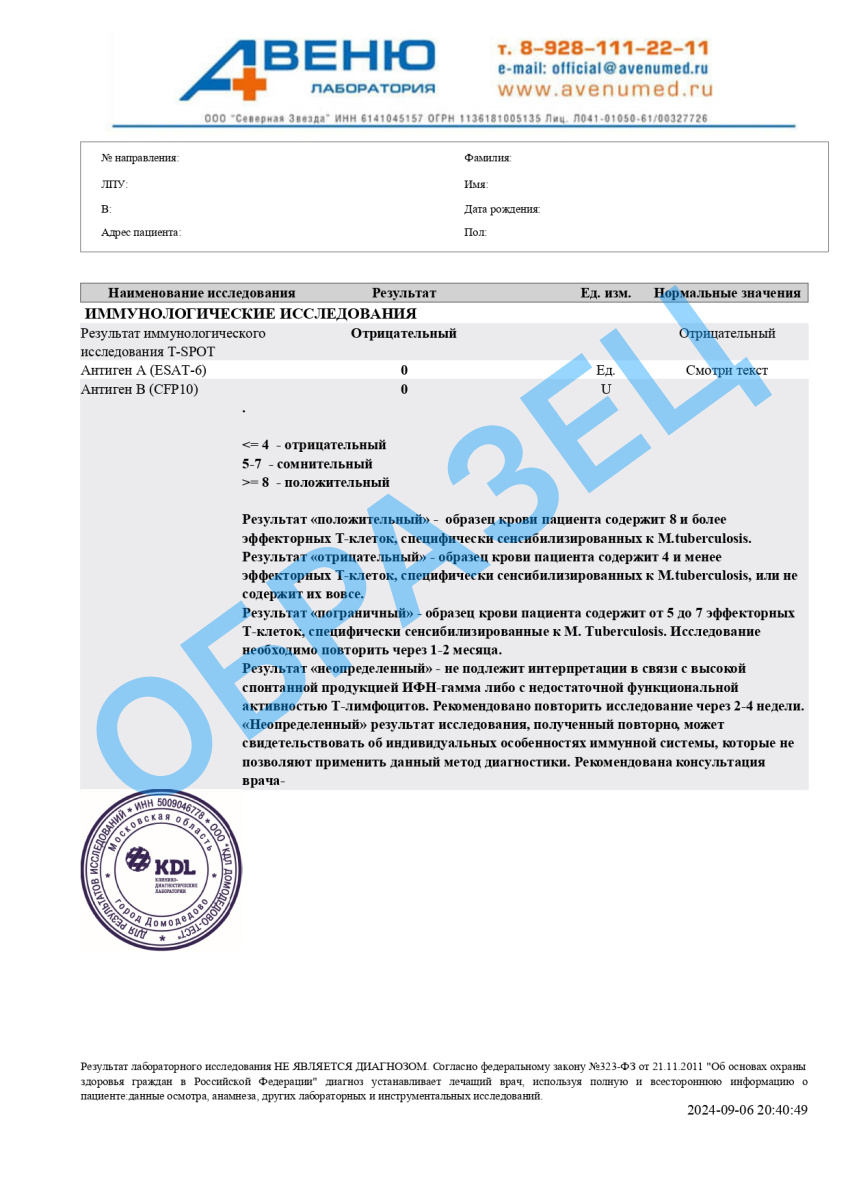 T-SPOT (инфицирование M. tuberculosis), взрослым и детям старше 12 лет
