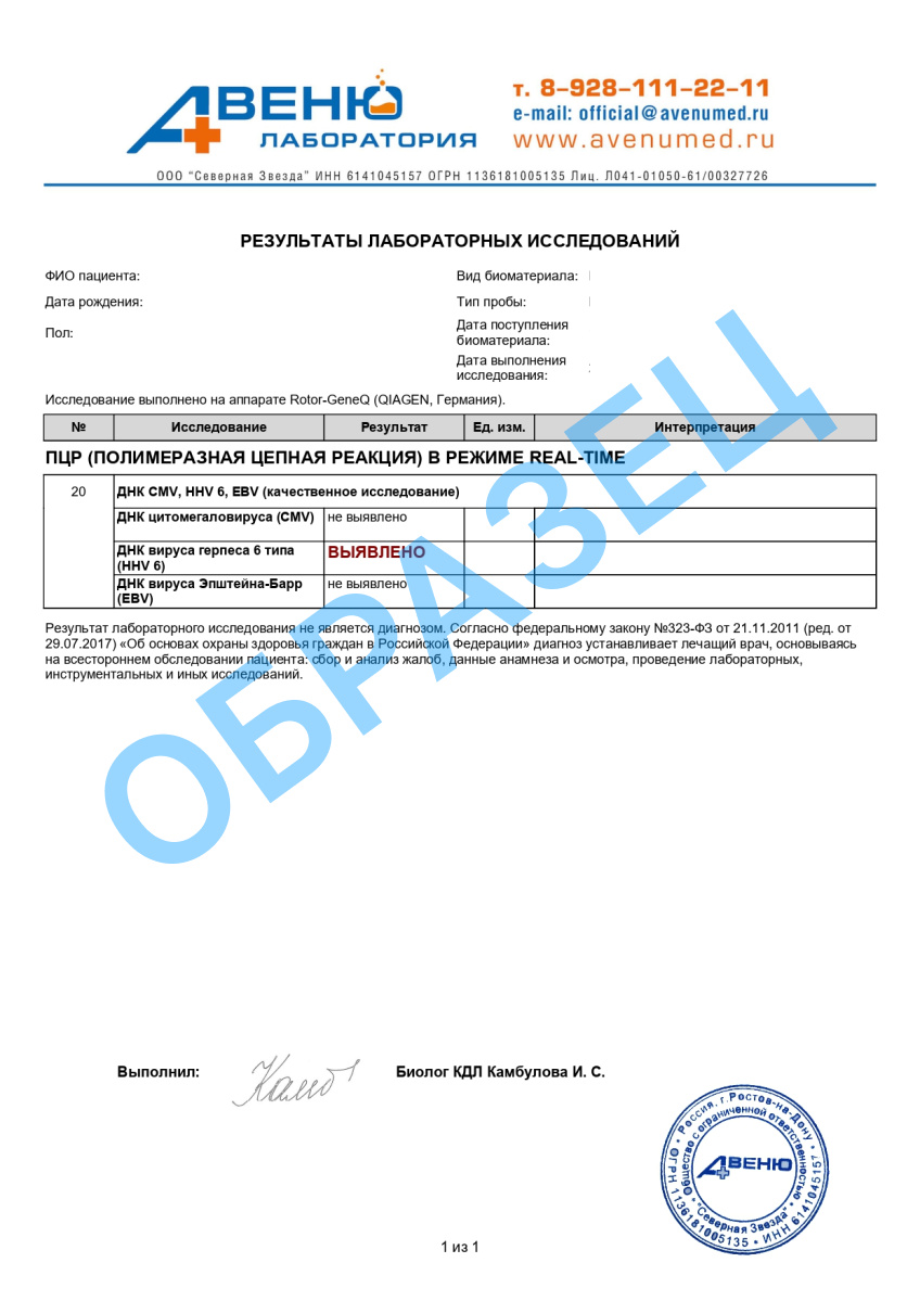 A26.05.033.001 Определение ДНК вируса герпеса 6 типа (HHV6) методом ПЦР в периферической и пуповинной крови, качественное исследование