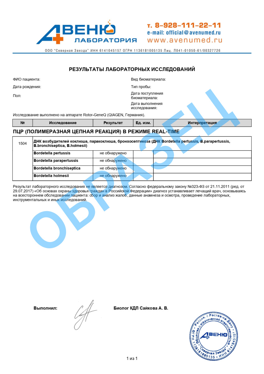 ДНК возбудителей коклюша, паракоклюша, бронхосептикоза (Bordetella pertussis, Bordetella parapertussis, Bordetella bronchiseptica, Bordetella holmesii), качественно