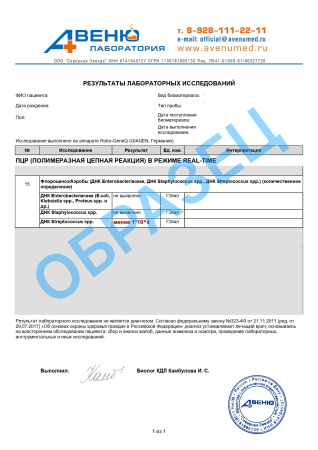 Флороценоз – Аэробы: ДНК Энтеробактерии, Стафилококки, Стрептококки (Enterobacteriaceae, Staphylococcus spp, Streptococcus spp, ПЦР), количественно