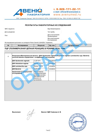 A26.20.032.001 Определение ДНК Gardnerella vaginalis, Atopobium vaginae, Lactobacillus spp. и общего количества бактерий во влагалищном отделяемом методом ПЦР, количественное исследование