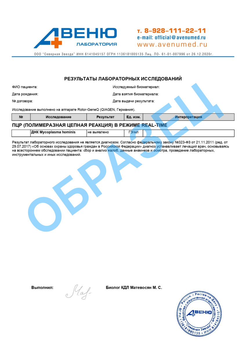 Качественный тест на определение ДНК Mycoplasma hominis ПЦР-методом даёт простую интерпретацию результата: «обнаружено» и «не обнаружено».
