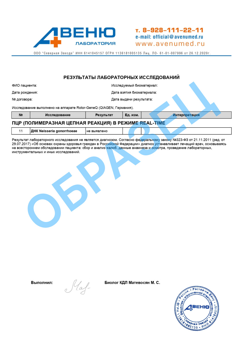 A26.20.022.001 Определение ДНК гонококка (Neiseria gonorrhoeae) в отделяемом слизистых оболочек женских половых органов методом ПЦР