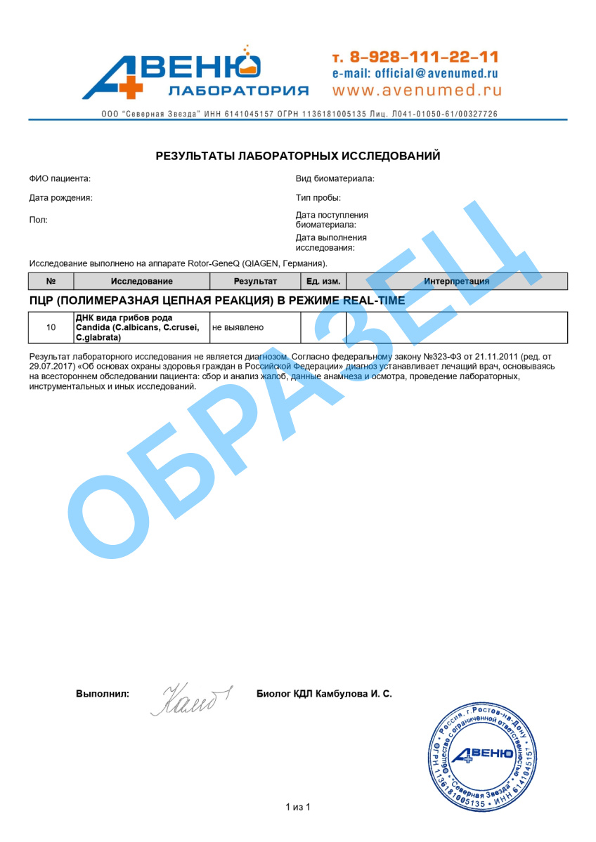 ДНК Кандида альбиканс, Кандида глабрата, Кандида Крузей ( Candida albicans, Candida crusei, Candida glabrata, ПЦР), качественно