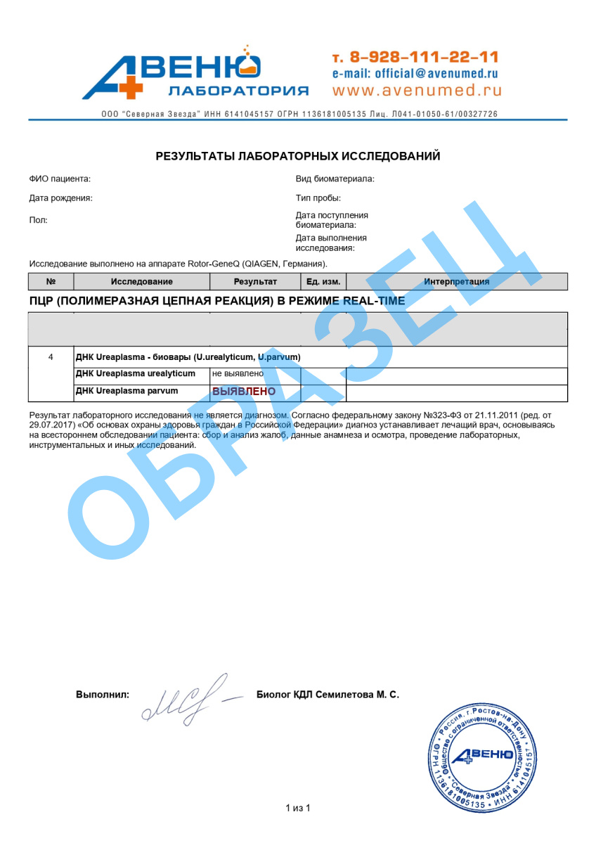 Исследование для нахождения ДНК Уреаплазма парвум и Уреаплазма уреалитикум ПЦР-методом предполагает результат в виде 2-х вариантов: «обнаружено» / «не обнаружено» или «положительный» / «отрицательный».