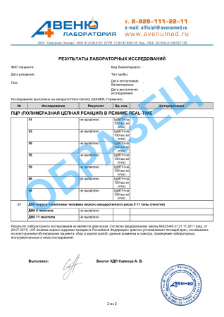 A26.20.009.008 Определение ДНК вирусов папилломы человека (Papilloma virus) 6 и 11 типов в отделяемом (соскобе) из цервикального канала методом ПЦР