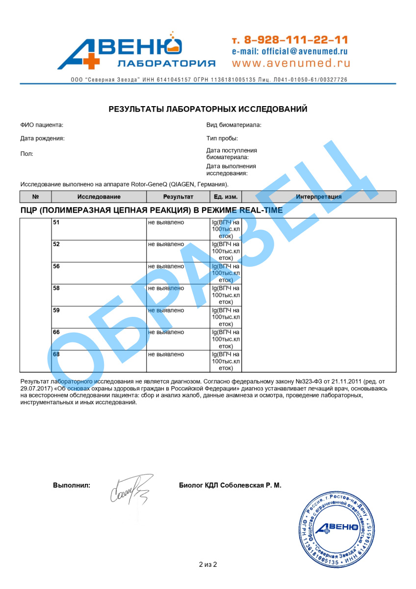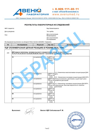 A26.20.012.003 Определение ДНК вирусов папилломы человека (Papilloma virus) высокого канцерогенного риска в отделяемом из влагалища методом ПЦР, количественное исследование