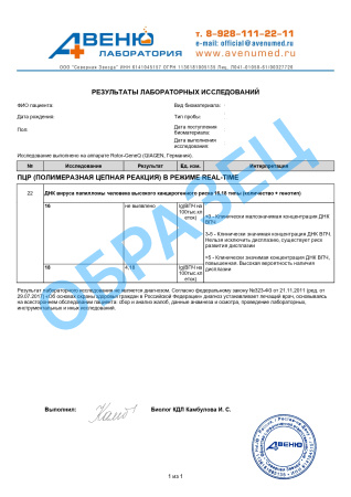 A26.20.009.006 Определение ДНК вирусов папилломы человека (Papilloma virus) 16 и 18 типов в отделяемом (соскобе) из цервикального канала методом ПЦР, количественное исследование
