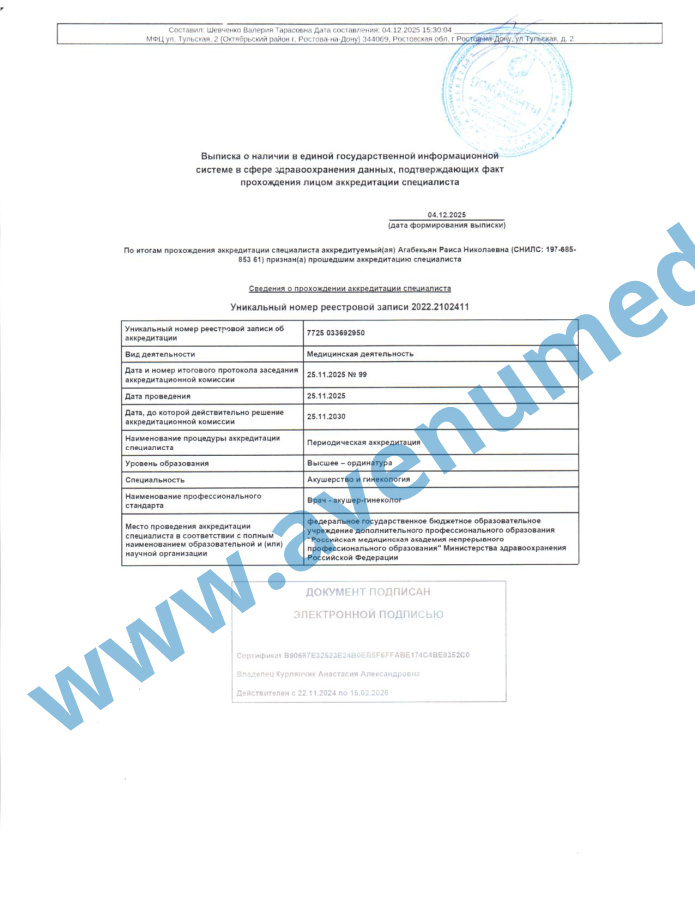 • 2016 г. - удостоверение о повышении квалификации врача "Актуальные вопросы акушерства и гинекологии", г. Ростов-на-Дону