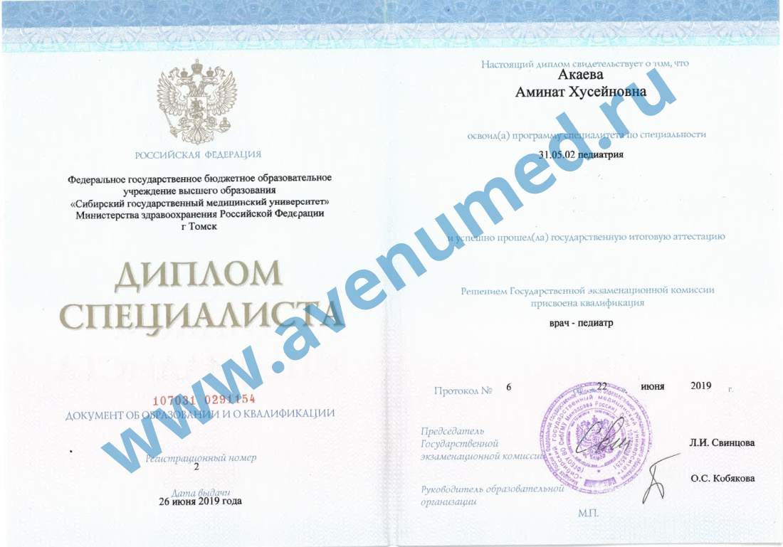 • 2019 г. - Сибирский государственный медицинский университет по специальности "Педиатрия".