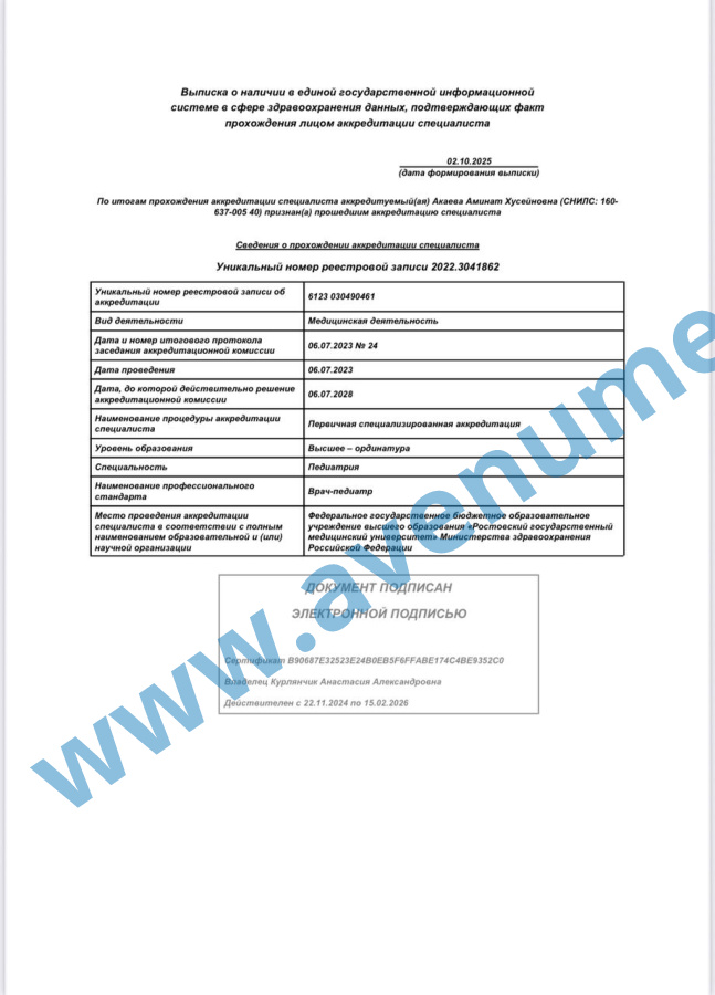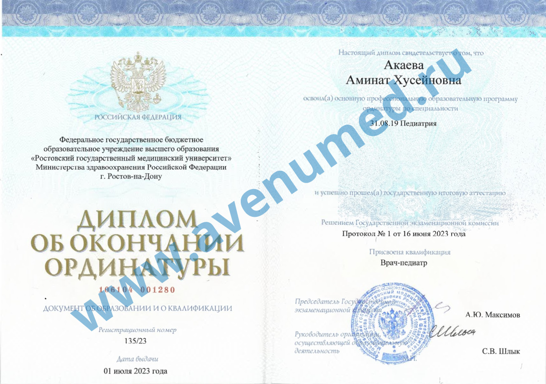 • 2023 г. - ординатура по специальности "Педиатрия", Ростовский государственный медицинский университет.