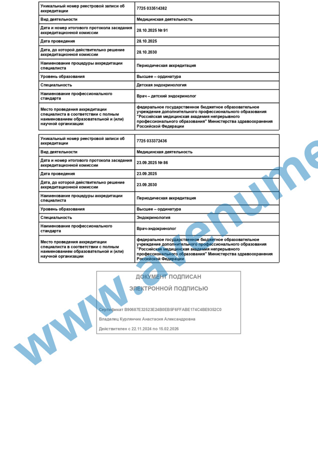 - 2019 г. - ординатура по специальности "Эндокринология", РостГМУ