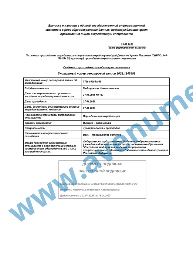 • 2016 г. - ординатура по специальности "Травматология и ортопедия", Ростовский государственный медицинский университет.
