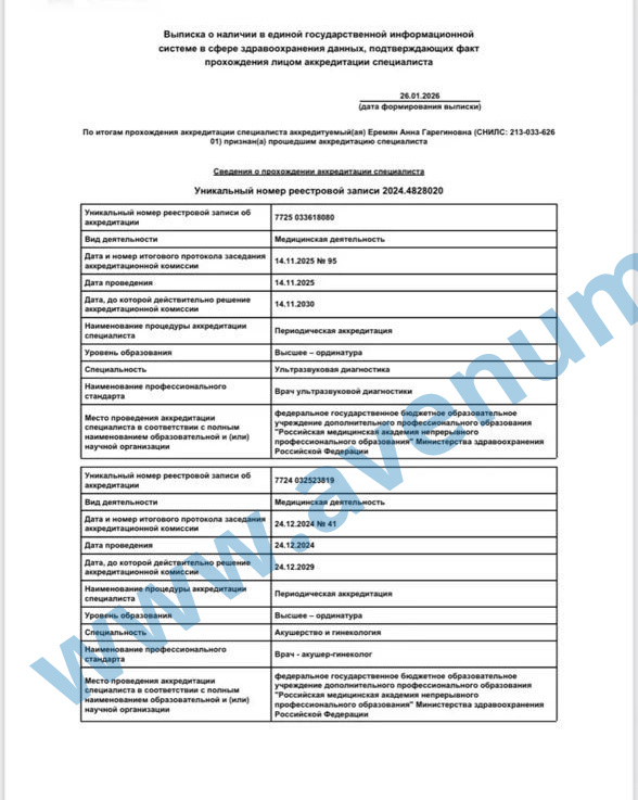 Анна Гарегиновна Еремян выполняет манипуляции по интимной пластике женщинам.Профилактический осмотр, инфекции, передаваемые половым путем, вагиноз, вагинит, эндометриоз, эрозия шейки матки, миома матки, адреногенитальный синдром, постменопауза, гормональные нарушения.