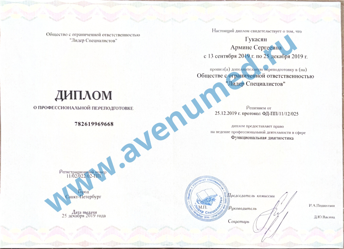 - 2019 г. - профессиональная переподготовка по специальности "Функциональная диагностика".