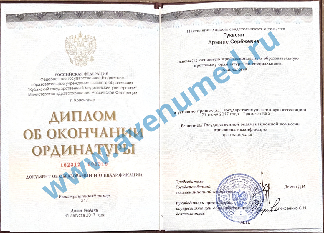 - 2017 г. - ординатура по специальности "Кардиология" на базе НИИ-ККБ №1, КубГМУ, г. Краснодар